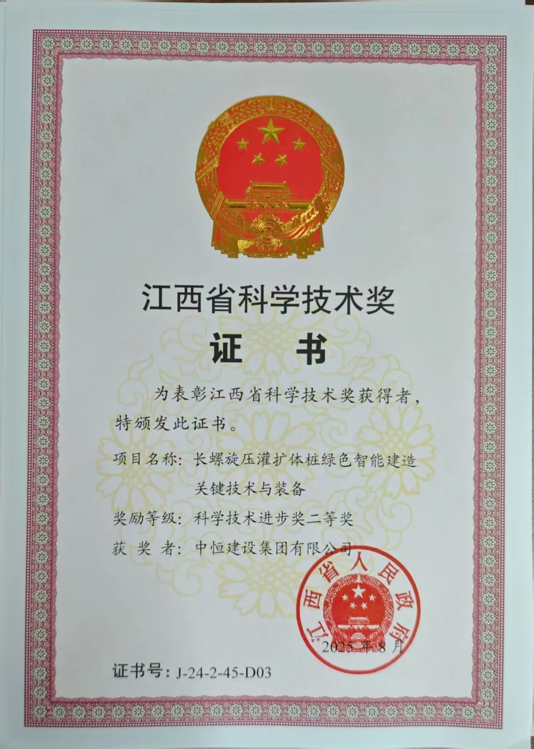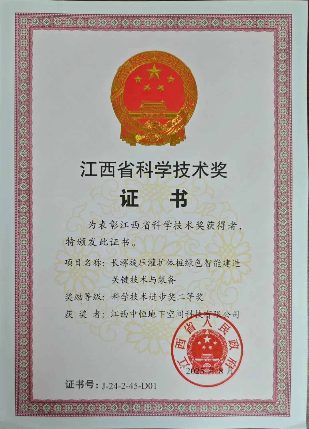 9月11日,全省科学技术奖励大会在南昌召开,隆重表彰2024年度江西省科技奖获奖单位和个人。省委书记尹弘出席并讲话,省长叶建春主持,省领导李红军、任珠峰、陈敏、罗小云、卢天锡出席,夏文勇宣读《江西省人民政府关于2024年度江西省科学技术奖励的决定》。在赣“两院”院士陈晔光、葛世荣、谢明勇等出席。江西中恒地下空间科技有限公司的《长螺旋压灌扩体桩绿色智能建造关键技术与装备》荣获2024年度江西省科技进步奖二等奖,集团党委书记、董事长聂吉利受邀参加大会。