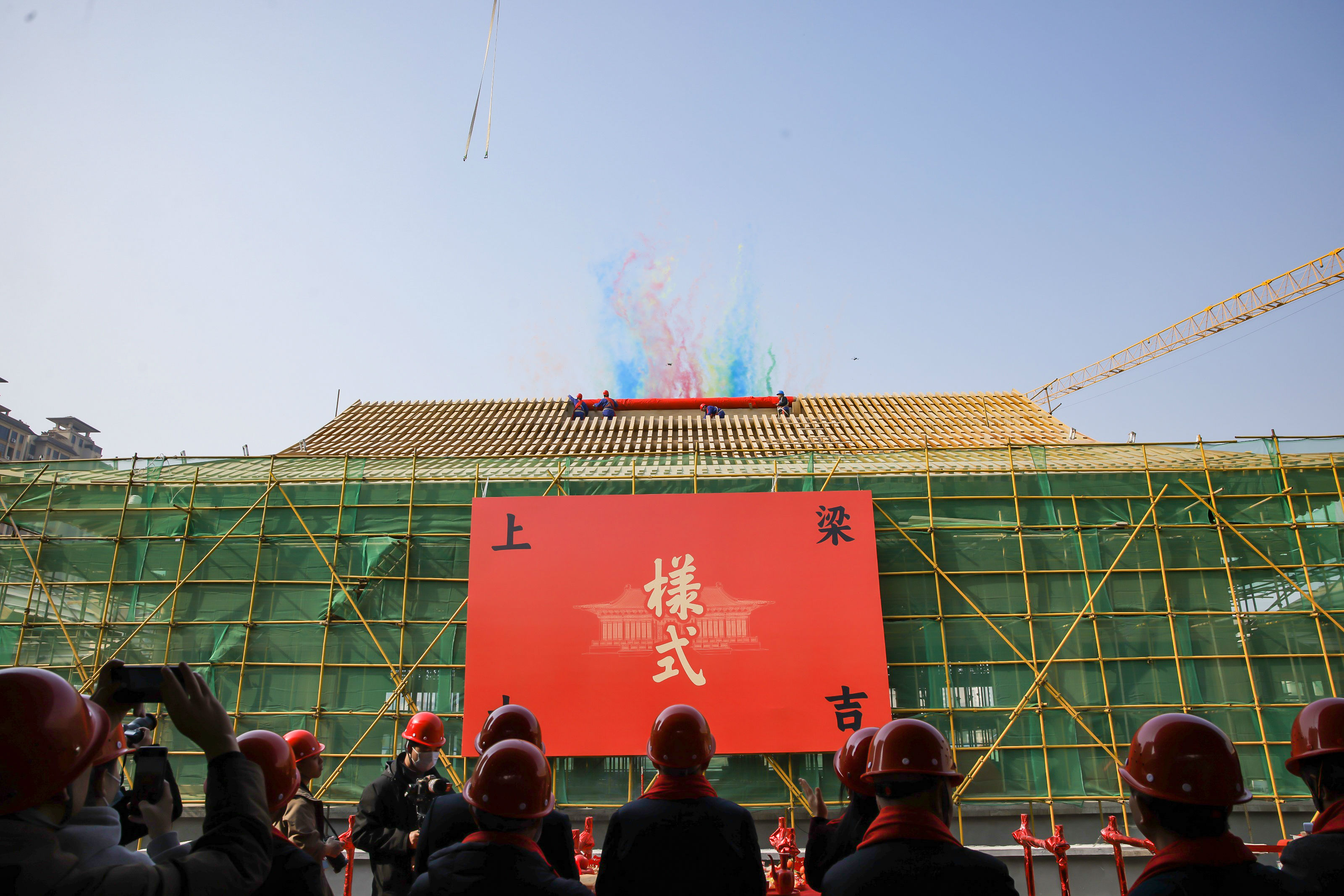 文投·样式园项目的上梁大典,更承载了对天地自然的敬畏、对工匠技艺的传承,对样式生活的美好向往。上梁大典严格遵循传统上梁文化的礼制,在前期“暖梁、画梁、缠梁”的筹备工作基础上,上梁大典依古礼进行拜梁、敬梁、祭梁、上梁、抛梁等系列仪式。