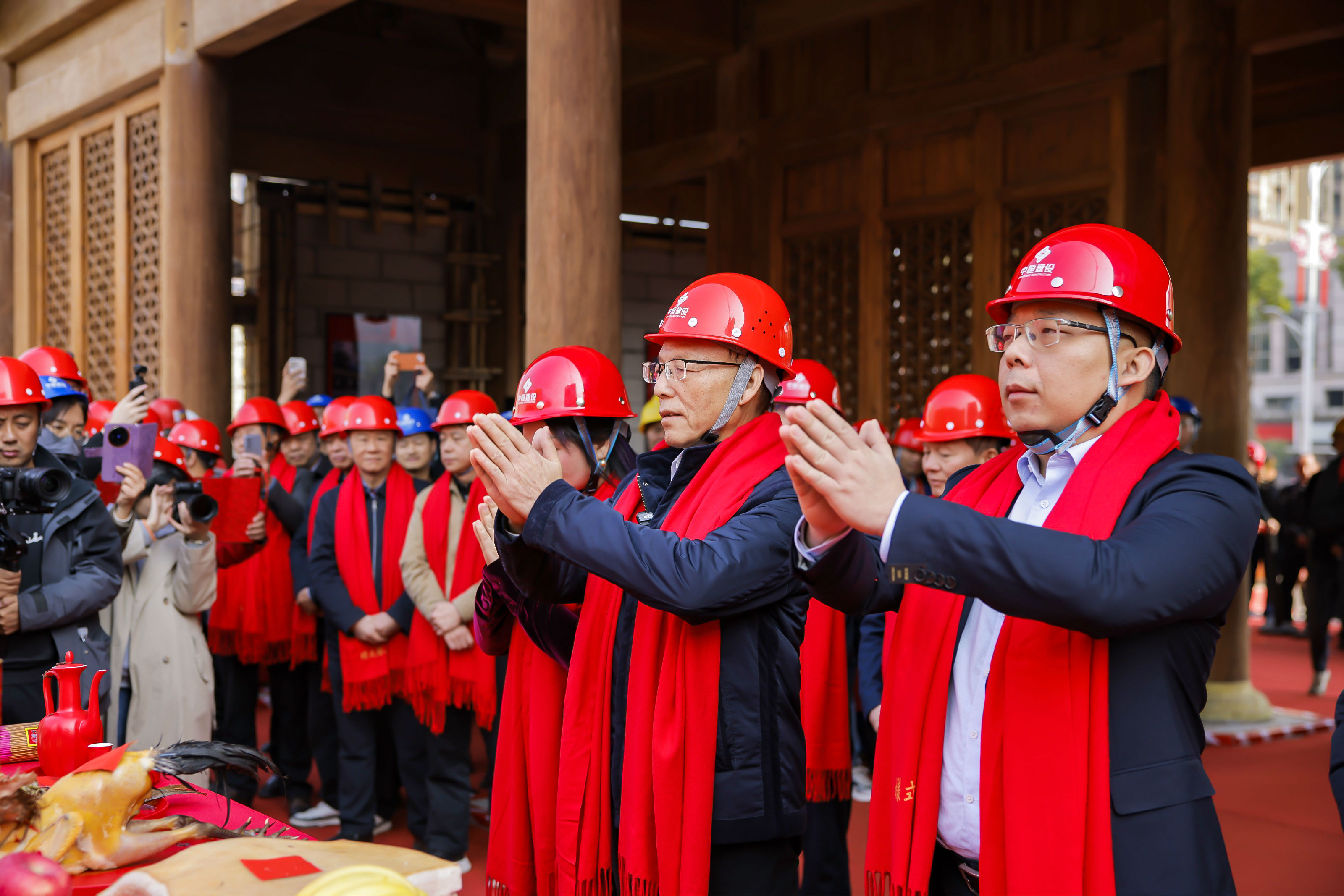 在庄重的唱诵与舞狮锣鼓声中,主礼嘉宾肃穆行礼,以清酒敬梁,以古礼祭梁。随着聂吉利董事长高声宣布“升梁,起!”,系着红绸的主梁在瑞狮欢腾、彩烟缭绕中平稳升顶,稳稳归位。抛梁环节则将吉祥的糖果与五谷撒向现场,寓意福泽共享,将活动气氛推向高潮。